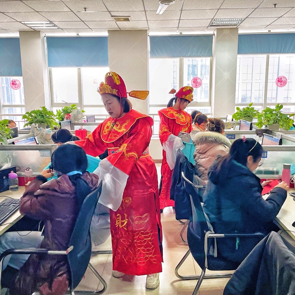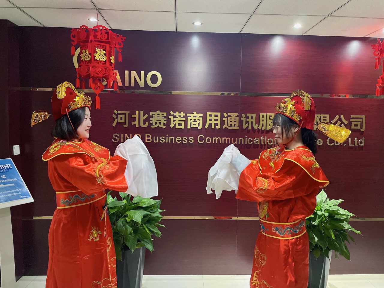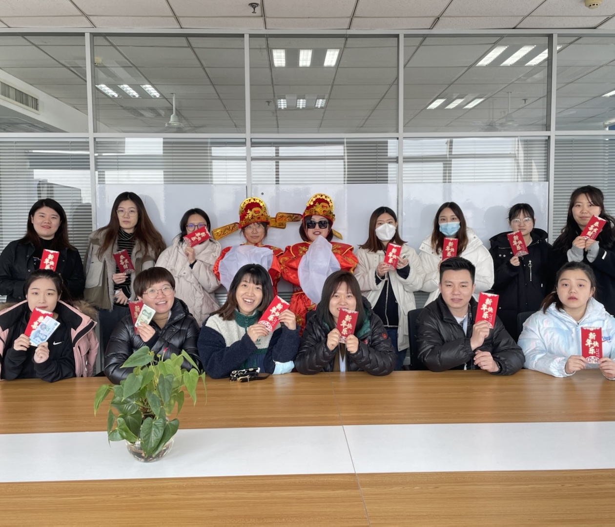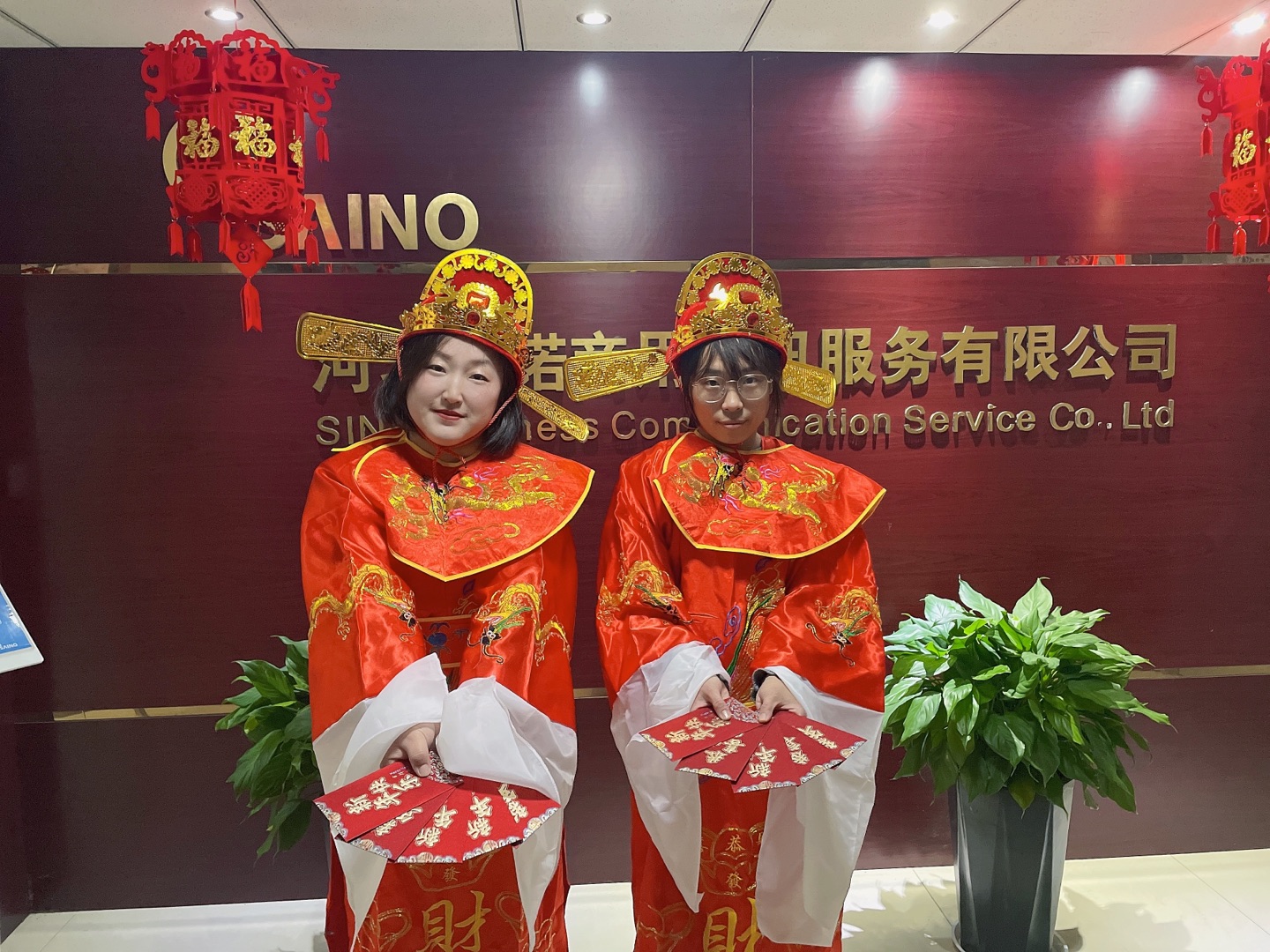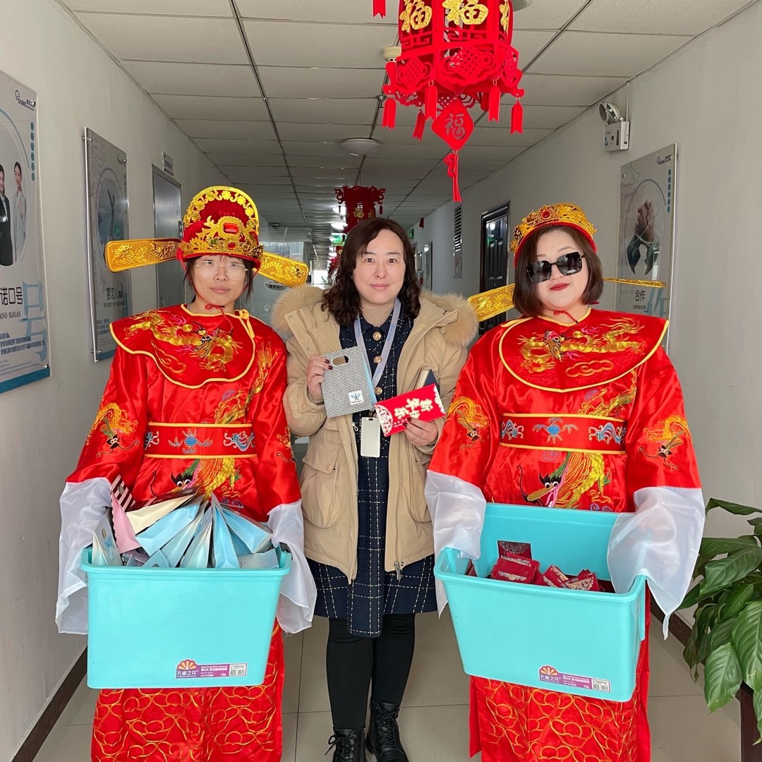 新年上班第一天,河北賽諾為小諾米們準備了開工紅包,并由兩位喜慶的“財神爺”親自送到小諾米的手里。